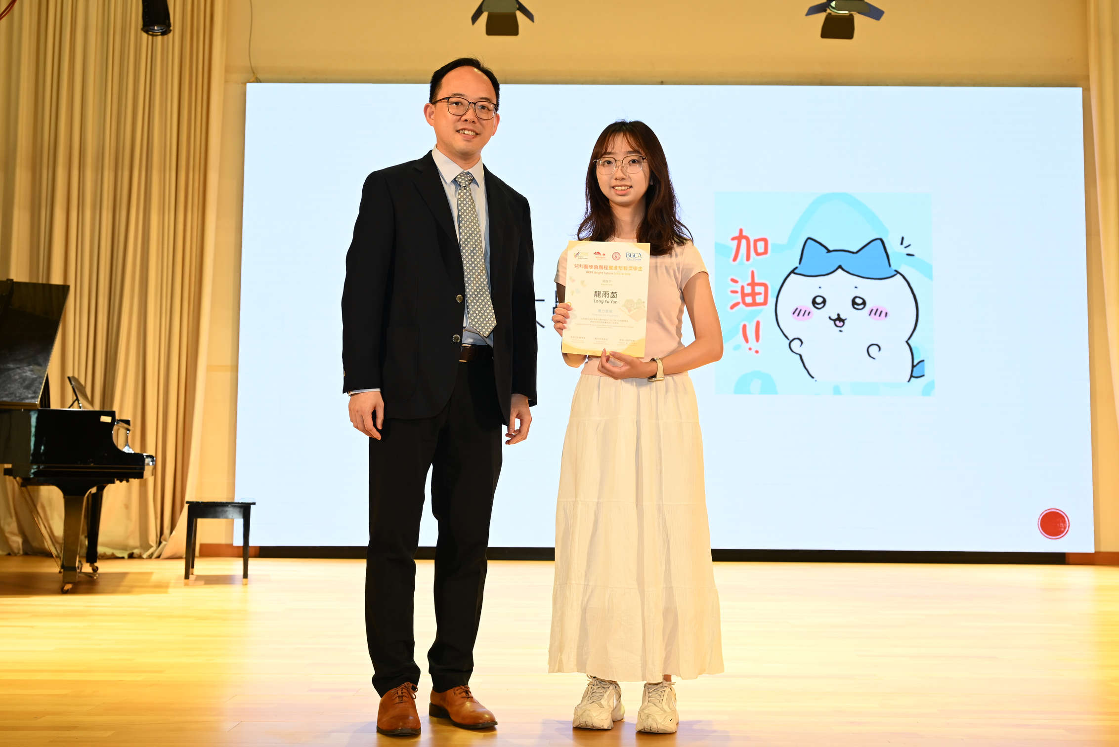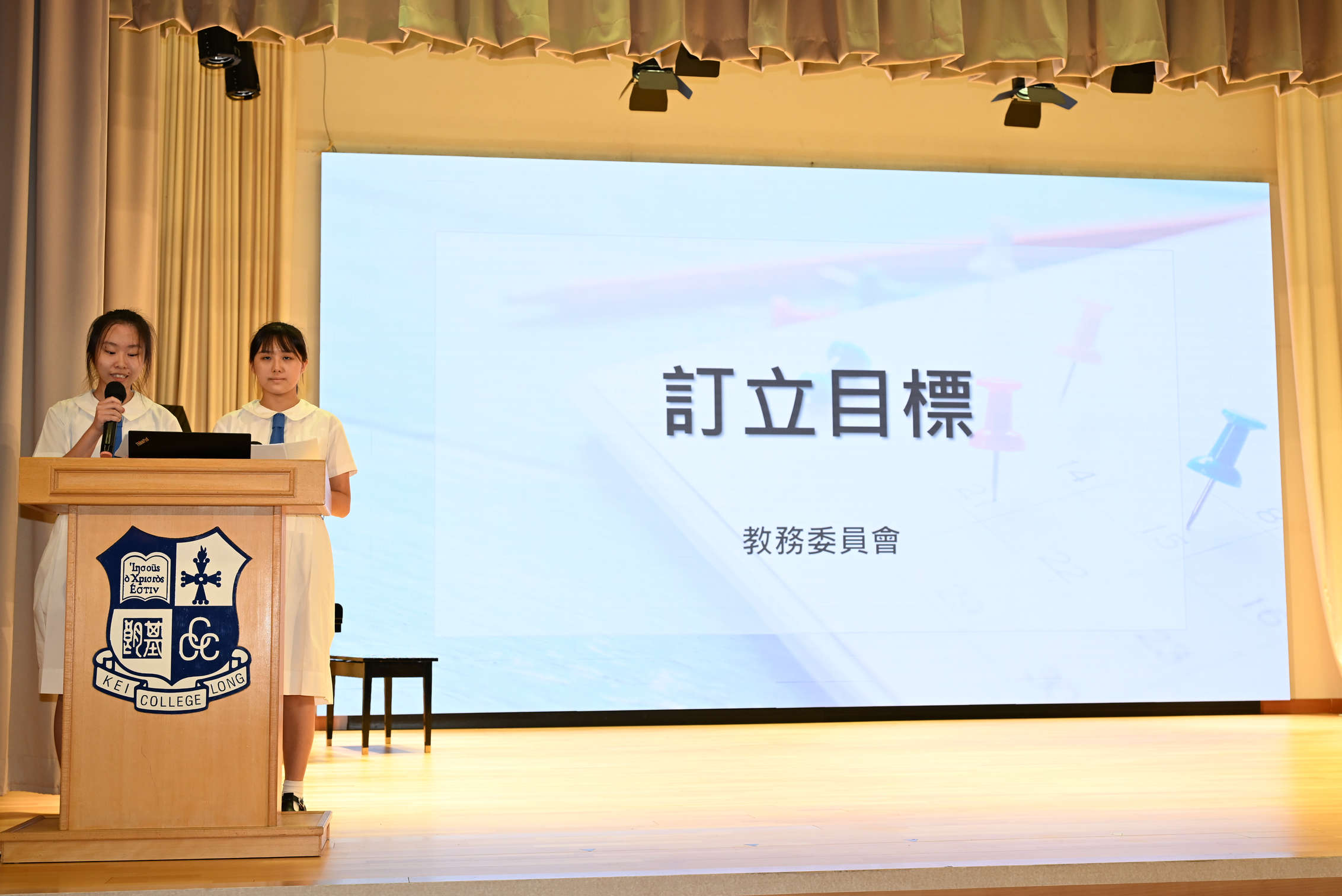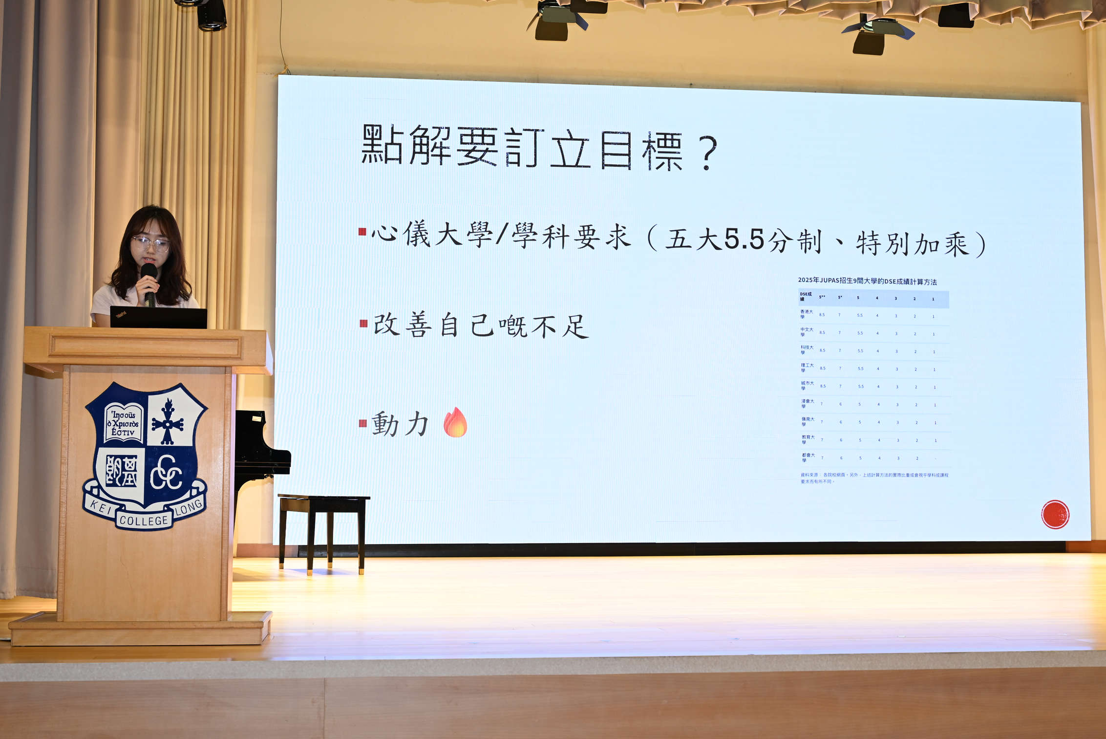 F.6 graduates sharing how to achieve goals and get good grades to our senior form students in the assembly
