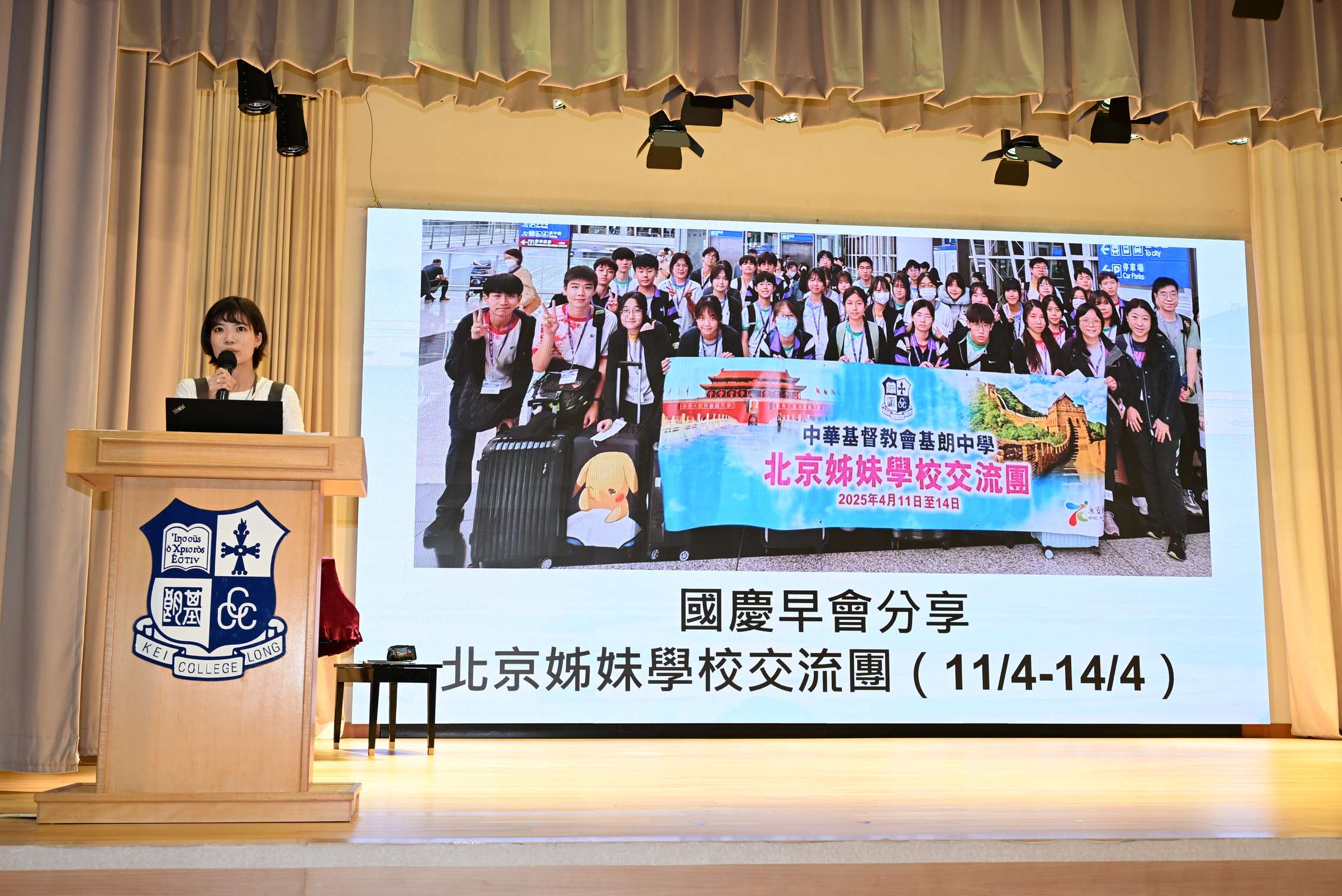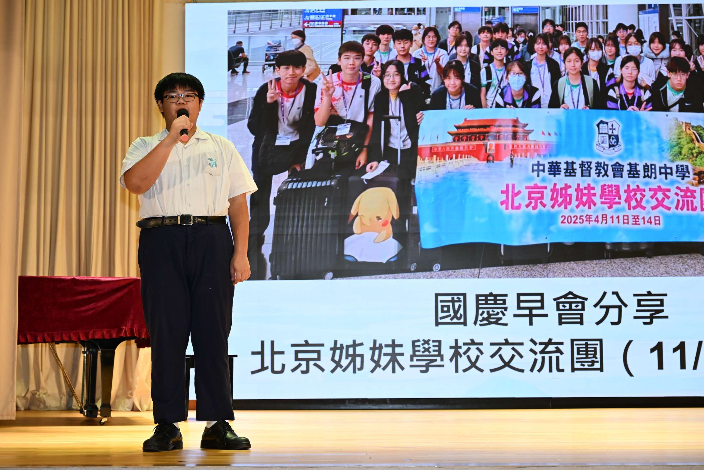 To celebrate the National Day, our school arranged for all students to attend National Day morning assemblies on September 29th and 30th. During these assemblies, staff from the Moral, Civic, and National Education Committee shared their thoughts on National Day, leading students to commemorate the nation's achievements and reflect on their responsibilities as citizens. They also considered the direction of national development and the significance of the National Day. Students who participated in previous Silk Road study tours and exchanges with sister schools in mainland China also shared their learning experiences and reflections during the assembly.